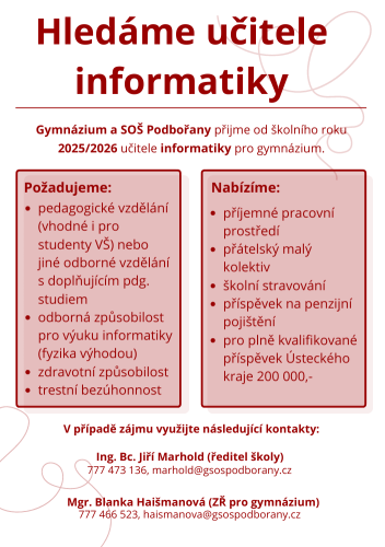 Gymnázium a Střední odborná škola v Podbořanech hledá učitele informatiky pro gymnázium od školního roku 2025/2026.